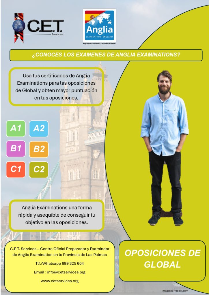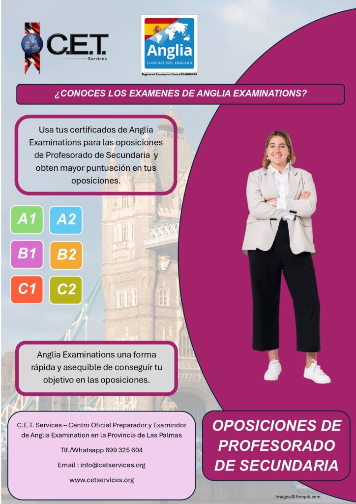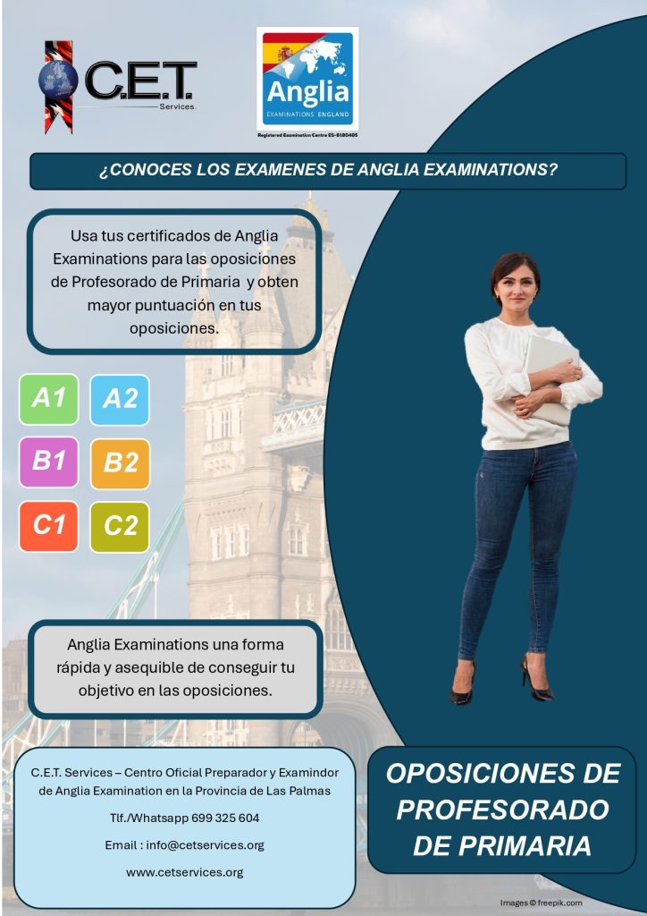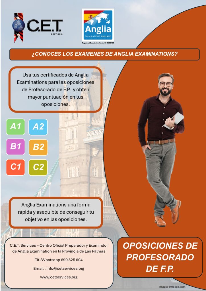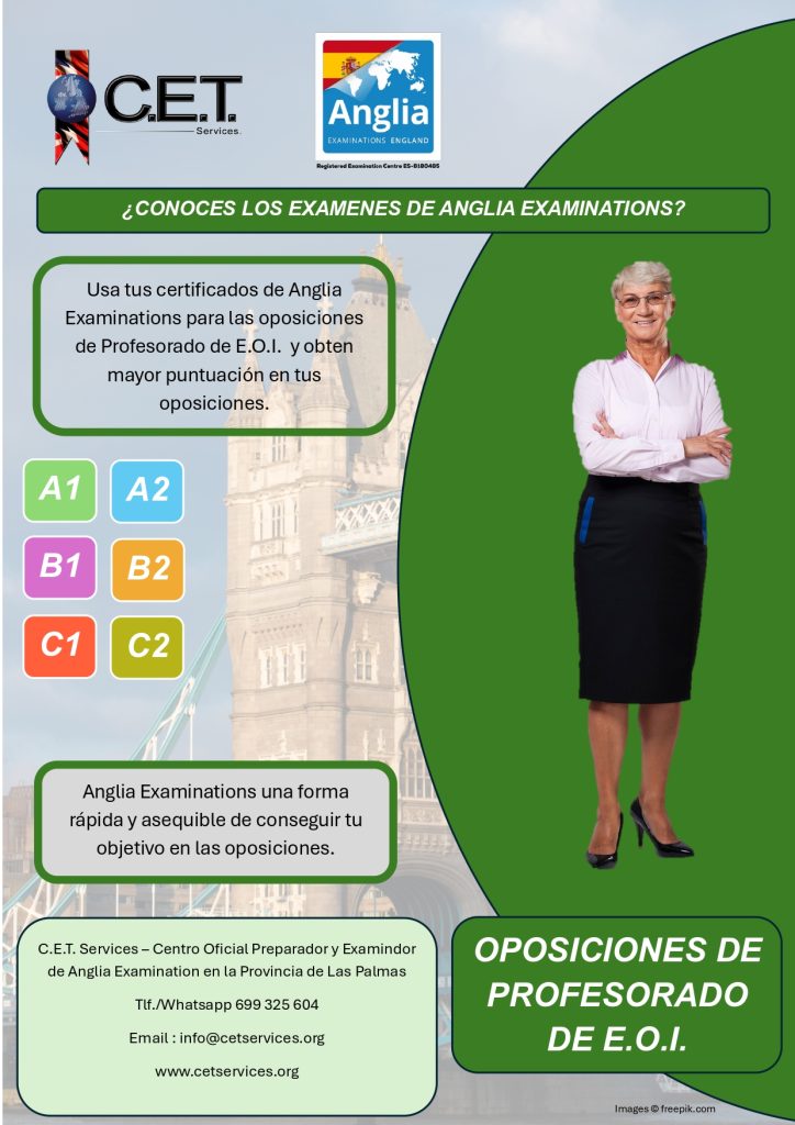 C.E.T. Services no es una academia, somos un Centro Oficial Preparador, Examinador y Testador de Anglia Examinations y de Trinity College London además de ser Centro Preparador para la Escuela Oficial de Idiomas Candidatos por Libre. Ofrecemos un amplio catalogo de servicios educativos relacionado con el aprendizaje de idiomas. Entra y Conocenos.